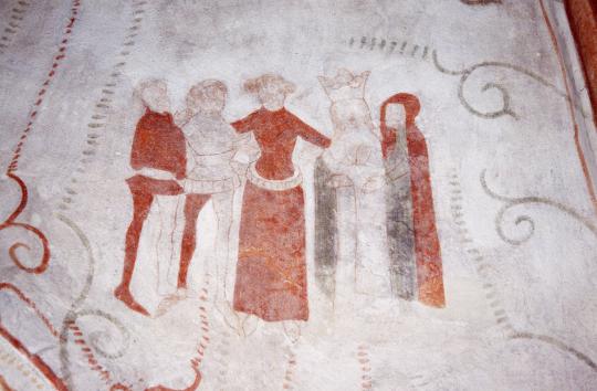 - Betrothal scene: the lady of the house (in the red gown) joins the couple's hands, wall-painting at Sværdborg church in Denmark, c. 1400-1410; in this scene, the the bride is the crowned figure, second from the right